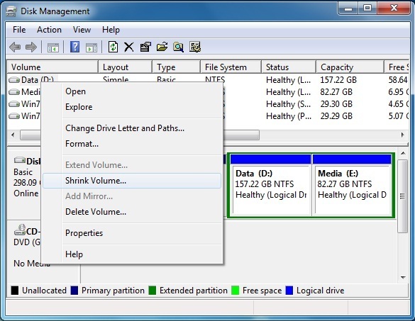 – Từ danh sách ổ đĩa hiện ra, bạn nhấp chuột phải vào ổ đĩa muốn chia và chọn Shrink Volume.