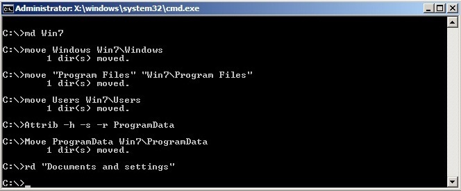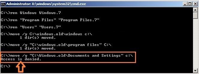 move /y “c:windows.oldDocuments and Settings” c: